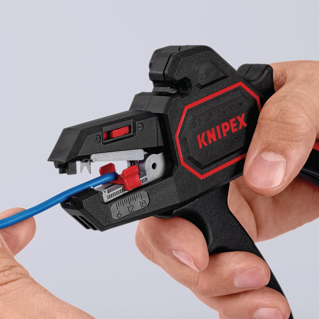 12 62 180 SB Automatic Insulation Stripper Strips cables with standard materials without any need for manual adjustment. Fine adjustable zero correction of the blade setting to special material requirements, e.g. due to large temperature differences. Compact, handy and lightweight tool for common cable cross-sections and insulating materials. For single, multiple and fine stranded cables of 0.2 up to 6 mm² with standard insulation. Narrow head style for use in confined areas. With wire cutter for copper and aluminium wires up to 2.5 mm². With adjustable length stop from 6.0 – 18.0 mm for constant stripping lengths. – Stripping capacities in square millimetres: 0.2 — 6.0mm²- AWG: 24 — 10