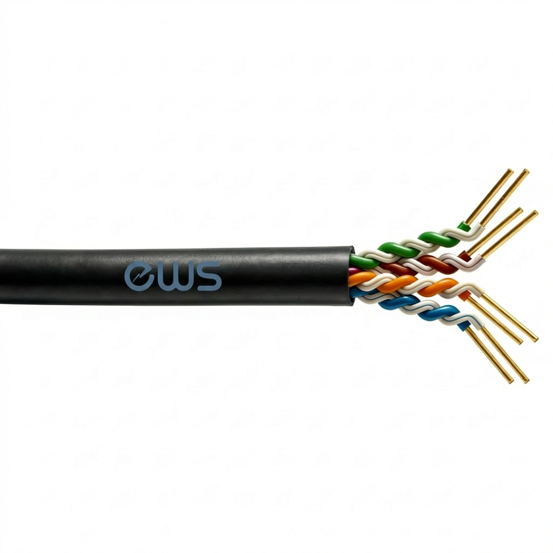 Solid conductor twisted pair data cable with PE sheath supplied in dispensing box and marked at 1 metre intervals. Suitable for high speed data transmission such as Gigabit Ethernet outdoor applications.