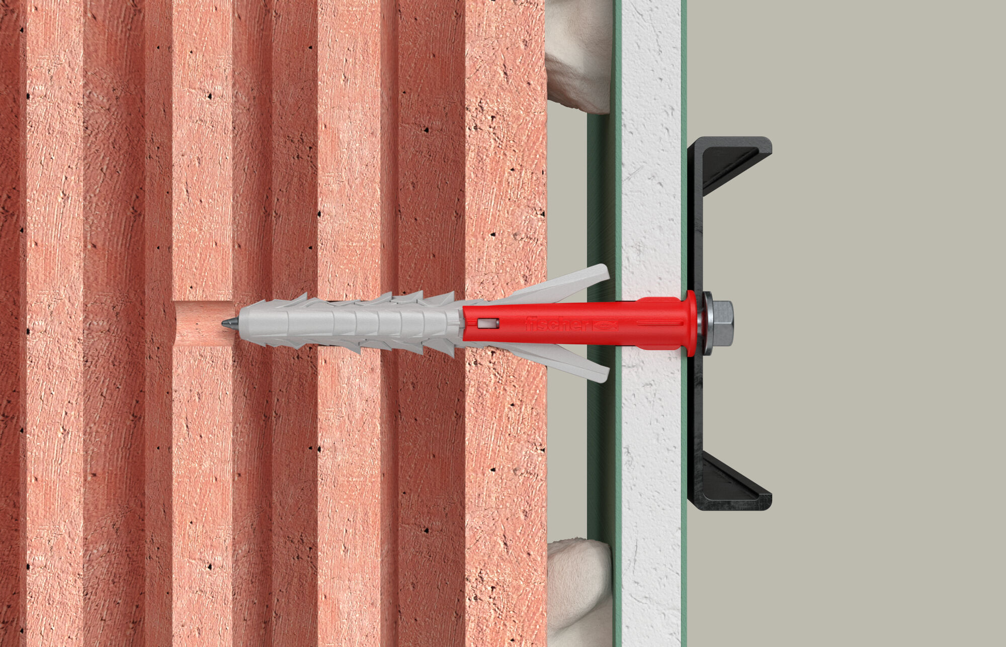 The plug DDF is the powerful solution for Dot and Dab walls where plasterboards are attached to the masonry using plaster or wooden battens. The red fiberglass-reinforced plastic shaft powerfully bridges the gap between the plasterboard and the load-bearing wall. The long expansion element made of grey high-quality nylon ensures strong and secure hold in the substrate. The plug DDF is ideally suited to fix heavy attachments such as swivelling TV brackets, radiators, heavy shelves or wall cabinets. The fischer safety screw with integrated washer and additional TX drive is included in the scope of delivery for an easy installation.