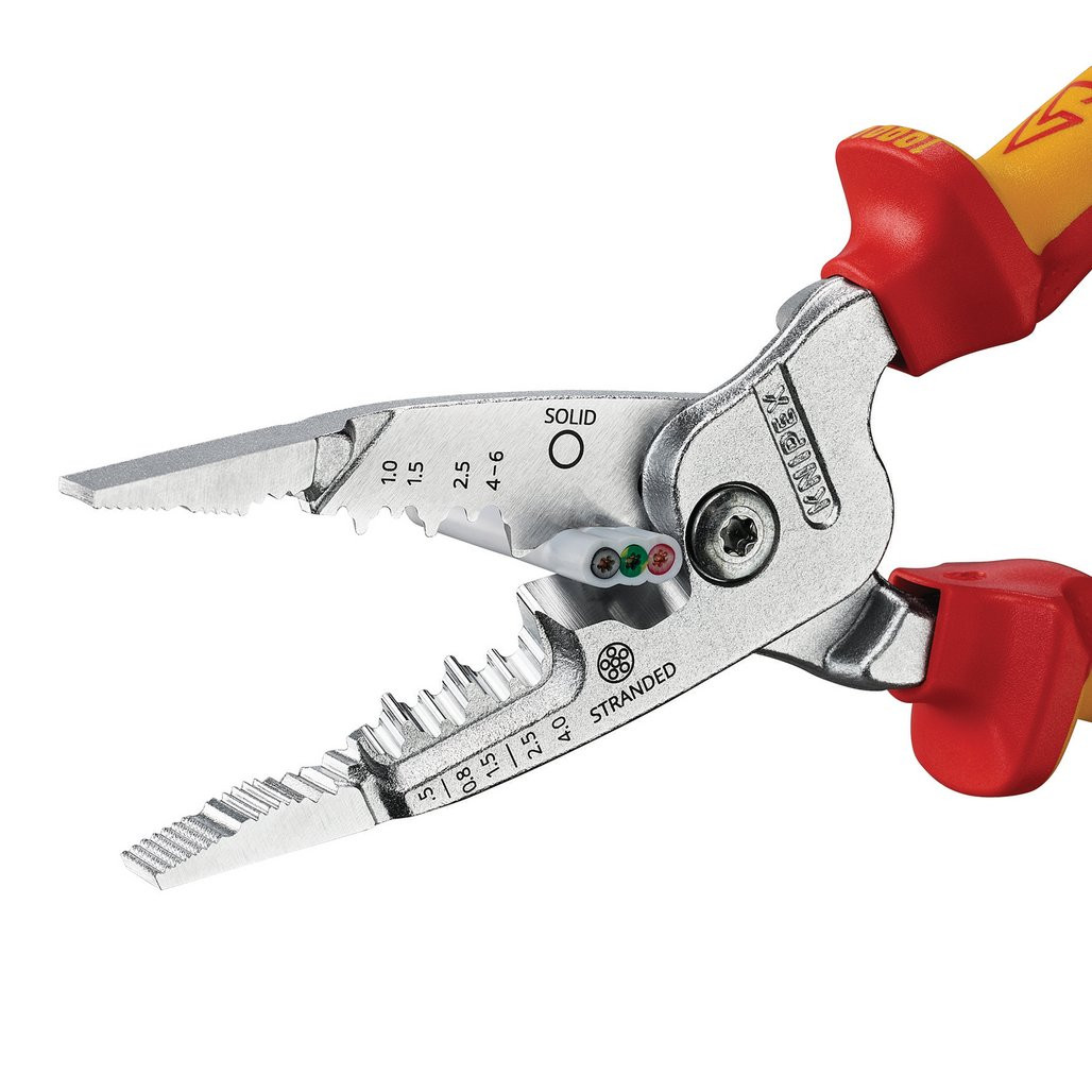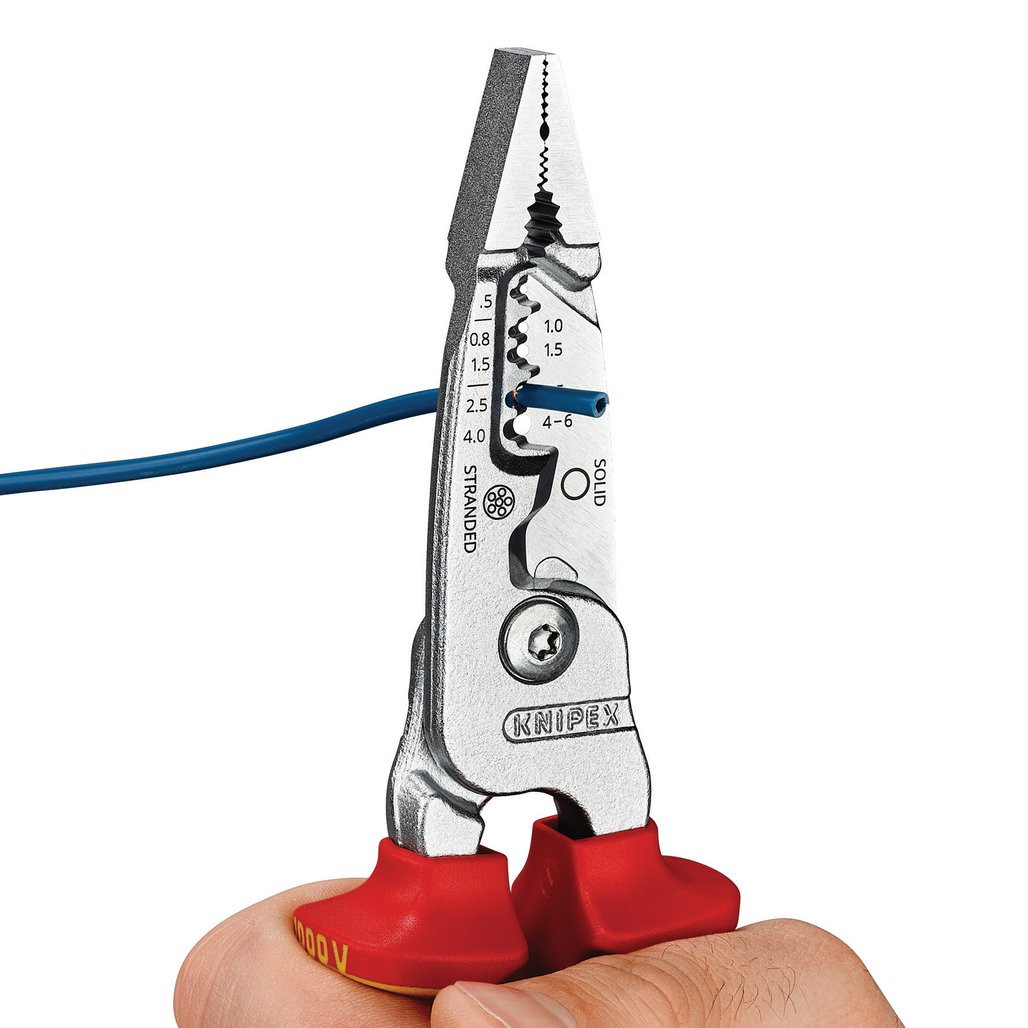 13 76 200 ME SB KNIPEX WireStripper Clever stripping: large capacity range, sharply ground stripping profiles and intuitive positioning. Innovative cutting geometry: easier cutting, especially of flat cables. Hybrid design: as flat as needle-nose pliers, as wide as combination pliers for high stability with good accessibility. Precisely ground stripping profiles for solid conductors from 0.75 – 6 mm² and fine-stranded conductors from 0.5 – 4 mm². Precise positioning of the wire thanks to location ridges. Easy cutting of copper and aluminium cables up to Ø 15 mm (1/2″). Wide, cross-hatched gripping surfaces for twisting wires. Milled groove for secure holding and pulling of small work pieces such as nails. Convex gripping surface on one side for secure gripping of flat material and gripping area for round material. Outer edges for deburring pipes.
