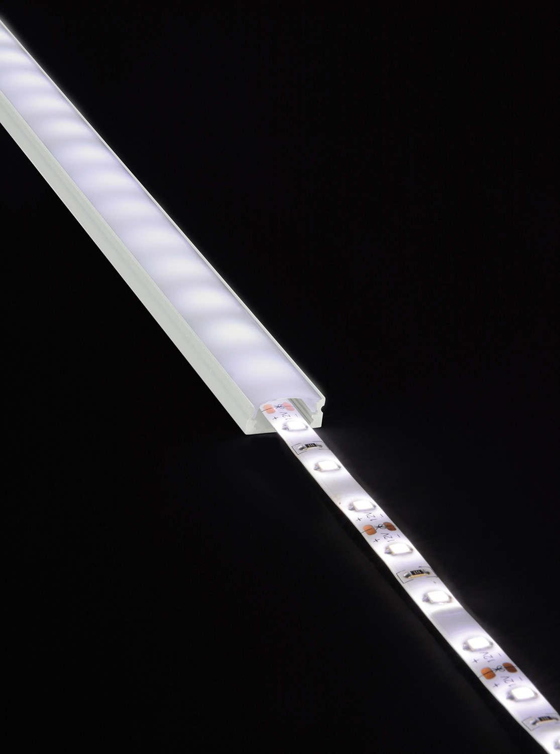 Extruded aluminium short section profile with crowned diffuser and fitting accessories for LED tape installation. Ideal for illuminating furniture and architectural details.