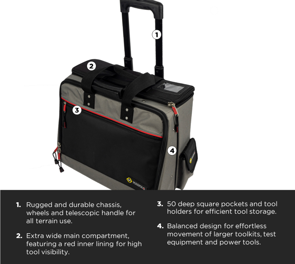 • The Technician’s PRO Wheeled Case is designed to store more than ever before and provides the perfect solution to effortlessly getting your tools to the job.