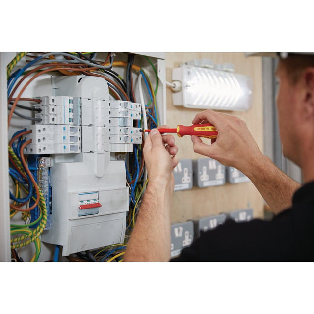 XP1000®, slimline blade with an insulated sheath the same diameter as the blade, enabling access to deep-seated screws found in terminals and switchboards. The patented dual-layer insulation ensures damage is highly visible. Individually tested to 10,000V, suitable for working on live circuits of 1,000V AC and 1,500V DC. Ergonomic soft grip bi-material handle allows free spinning in the palm of your hand to quickly tighten screws, but also allows transfer of torque when needed. Designed with flat sides to prevent them from rolling. SCVM steel blades hardened, tempered and chemically blackened with a precision-machined tip for exact fit to prevent screw damage.